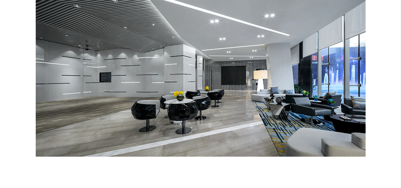 体验馆旨在于营造集智能科技,绿色生态为一体的体验式展示空间。 空间线与形是按分割和单纯的比率构成的,而且是以垂直线和水平线结构为主。连续的折面体系将服务台、顶面与地面连为一体,丰富了空间的张力和视觉冲击力。