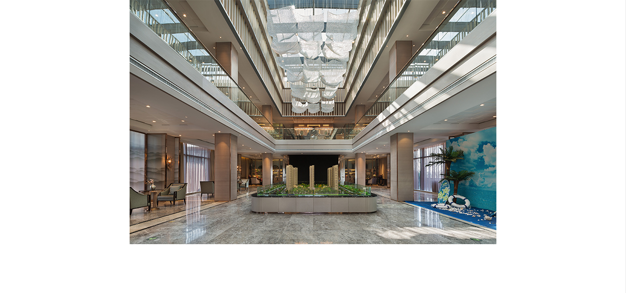 整个中庭区域,9米的挑空尺度,用直接而干练的木色栅嵌入其中,和垂挂于中心的水晶装置以聚合空间,不仅增强了空间层次,同时营造了强烈视觉冲击力的空间感受。